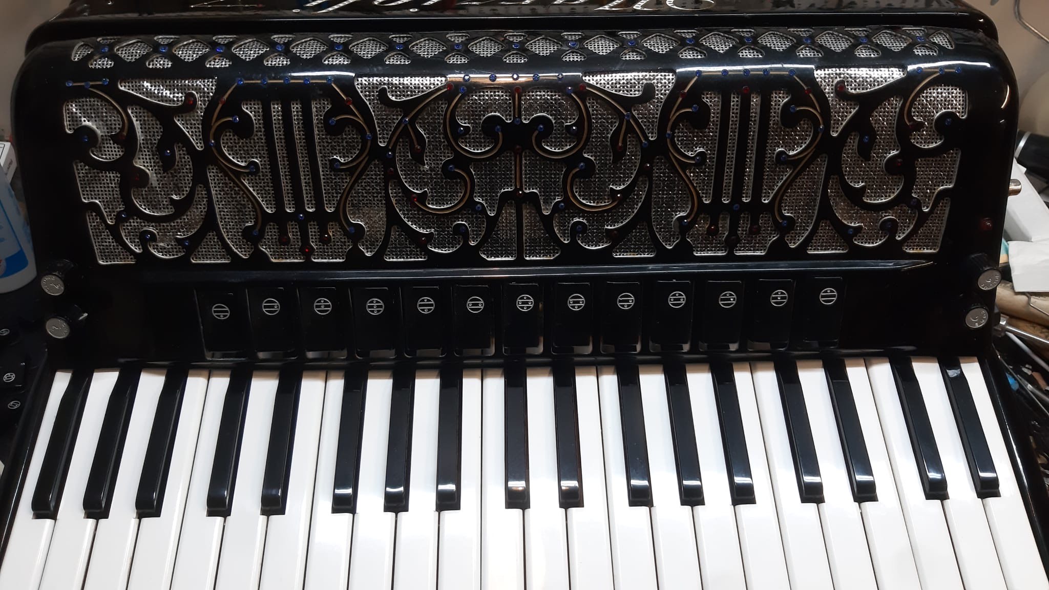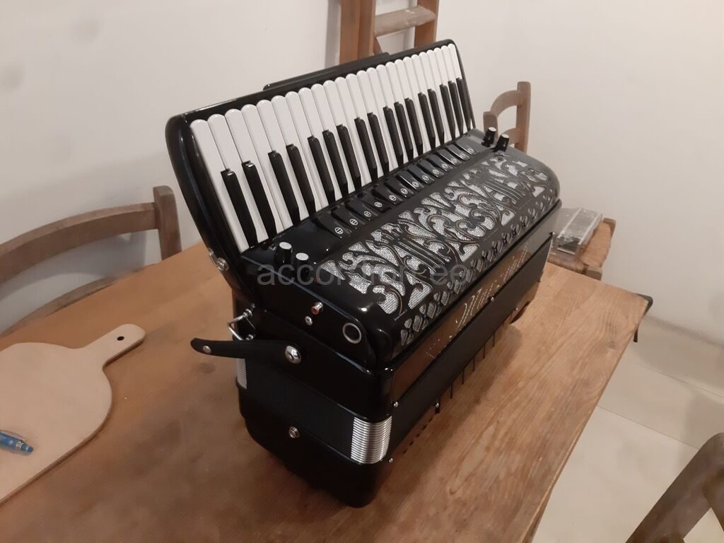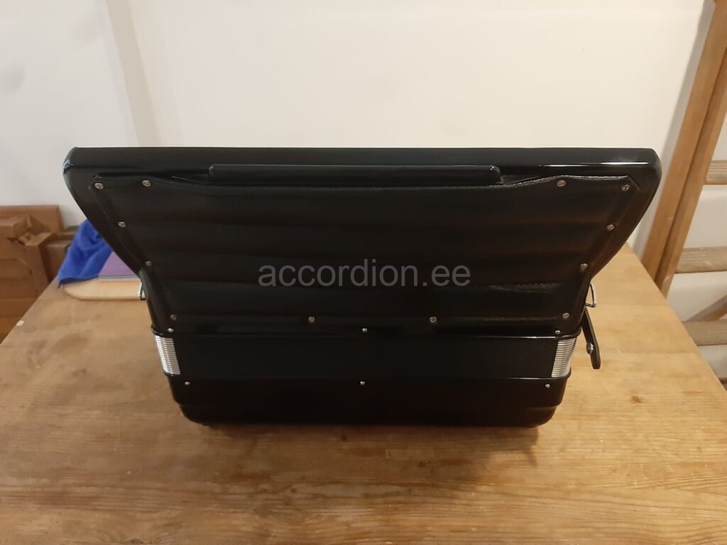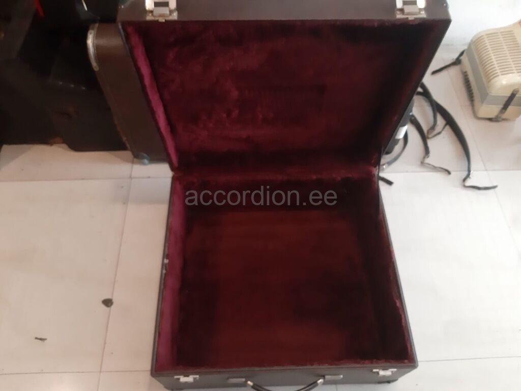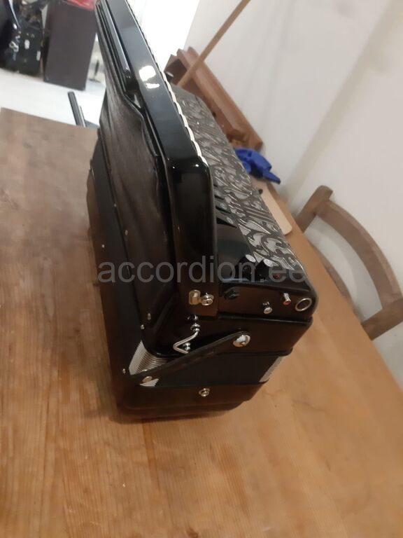 Castelfidardos käsitööna valmistatud akordion. Heas seisukorras vähe kasutatud akordion on värskelt häälestatud ja täiesti töökorras. Akordionil on 4 koori paremal ja 5 koori bassides. Häälestus on klassikaline 44O Hz (Piccolo register)Registreid on paremal 13+ Master ja bassides 5. Ilus punane lõõts, lõõtsakaitse ja mustad bassinupud. Akordion on nagu kunstiteos, dekoreeritud Swarowsky keistallidega. Sobib mängimiseks nii täiskasvanud pillimehele, kui ka muusikakoolis õppivale lapsele. Komplektis on pehmendusega õlarihmad ja transpordikast.